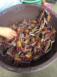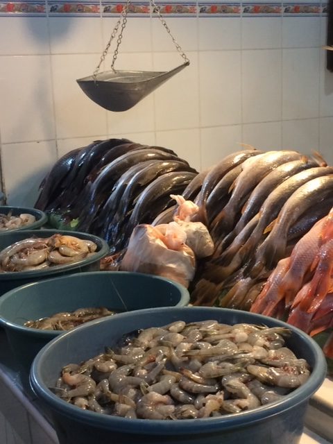 I never completed my visual description of the meat and seafood sections of the market. The quality control measures in the meat, fish and dairy sections of the market are a bit different to what I was used to. Those with weak stomachs should abstain from reading this paragraph. The strong smell of seafood and rotting meat forced me to hold my breath as I ventured down the dark stuffy alleyway to the fishmongers. Gingerly, I walked by the hanging carcasses of beef as the smiling vendors gestured proudly to the piles of long purple cow tongues, fleshy beige tripe (intestines), and bloody chicken feet. Annoyed, I swatted at the flies buzzing noisily around my head. I tread carefully of the slippery floor trying to avoid bloody patches. I dodge the live crab desperately trying to escape from his bucket. The lobsters snapped lazily at me from their beds of ice. Curious, I peered at some small grey round rubber balls in a purple bowl. I asked the vendor what they were. He was evasive and appeared reticent to want to make a sale. Only later did I realize that these were illegal turtle eggs. I never bought any red meat from the market. I was too afraid of getting sick (read about out worm experience here.) But I did buy fresh fish which was filleted and prepared on the spot for me. I also found huge fresh jumbo shrimp which were inexpensive and delicious. The eerie experience of walking down the meat aisle made up for the delicious home cooked food.
