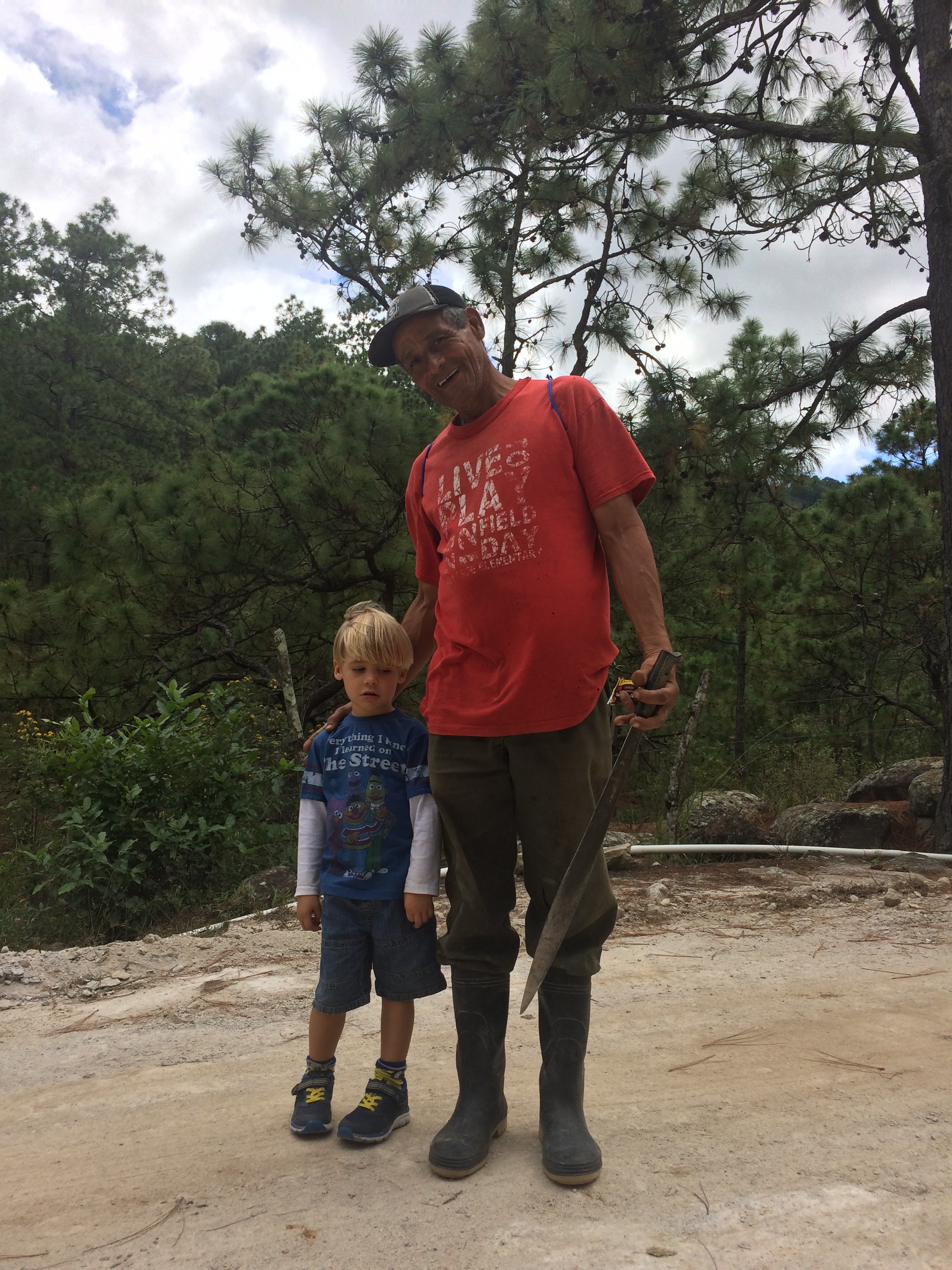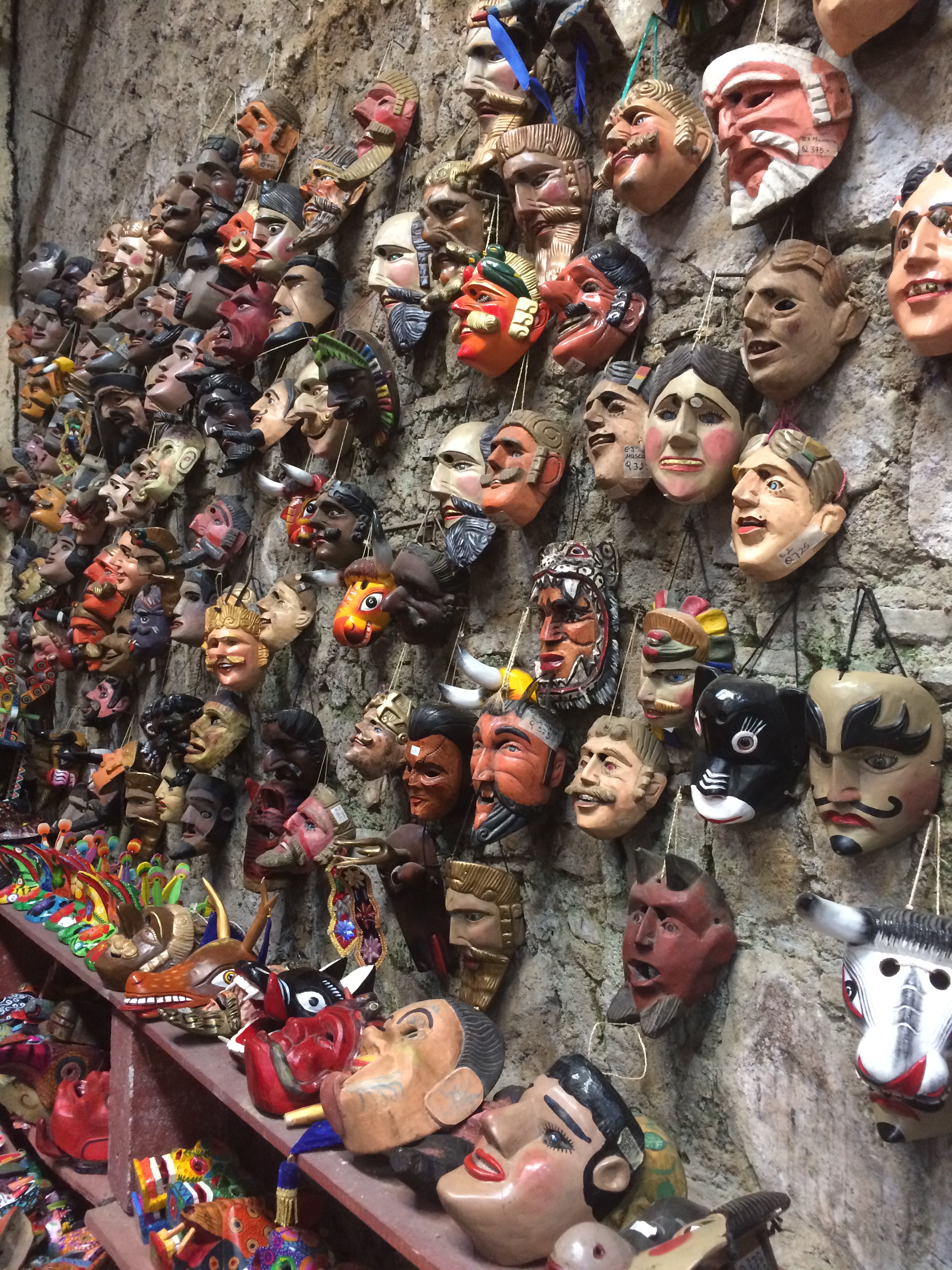 Clockwise from top left hand corner: Model police car at the Chiminike in Tegucigalpa, Masks for sale in Antigua Guatemala, Don’t touch the machete little boy!